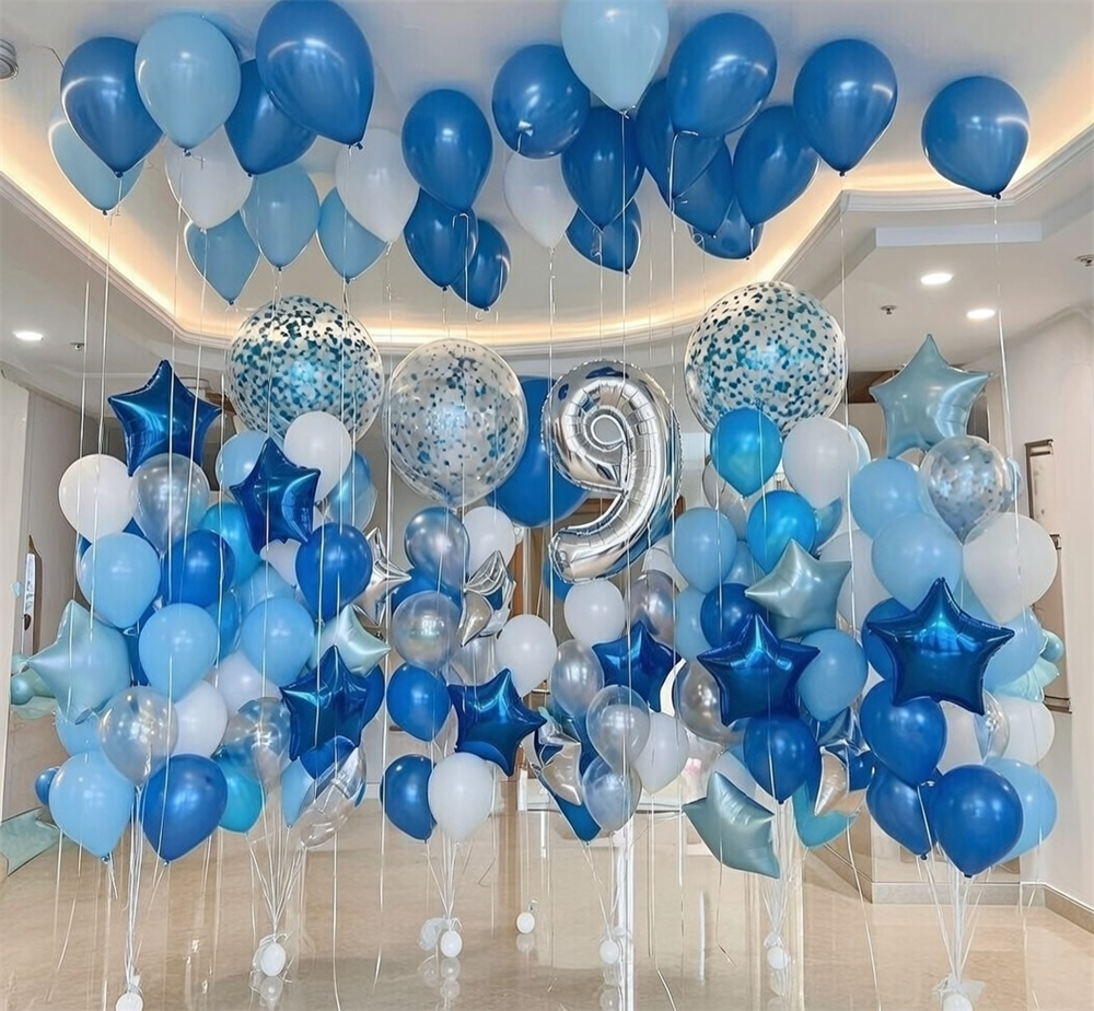 4 фонтана по 15 шаров+2 фонтана по 17 шаров+шар 61см на грузе+цифра на выбор+30 шаров под потолок №4