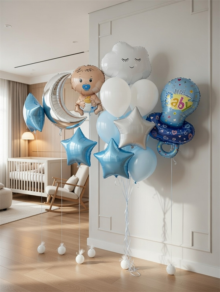 Фонтан из 10 воздушных шаров + Звезды + Соска + Полумесяц №659а