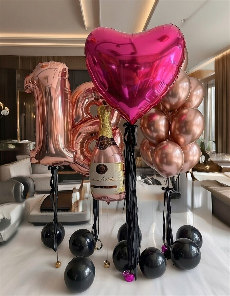 Фонтан из 10 воздушных шаров + Цифра (2шт) + Сердце + Бутылка шампанского + 8 шаров на пол №204а