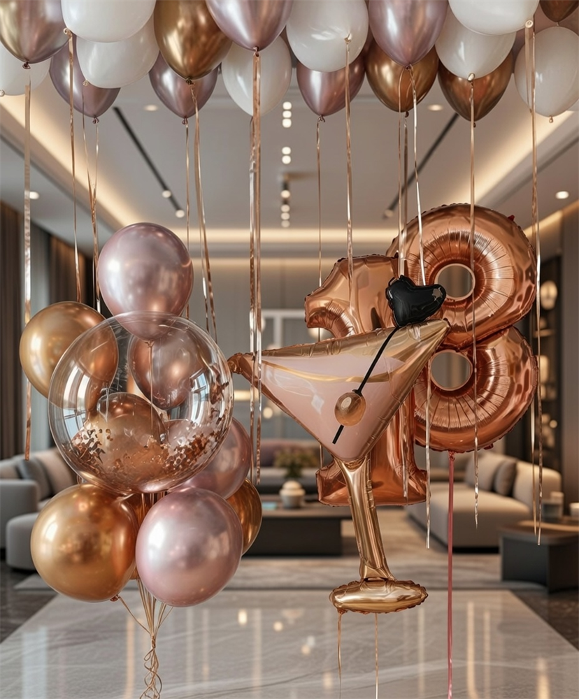 Фонтан из 10 воздушных шаров с Шаром Гигант с коны + 18 воздушных под потолок + Цифра (2шт) + Бокал Мартини №203а